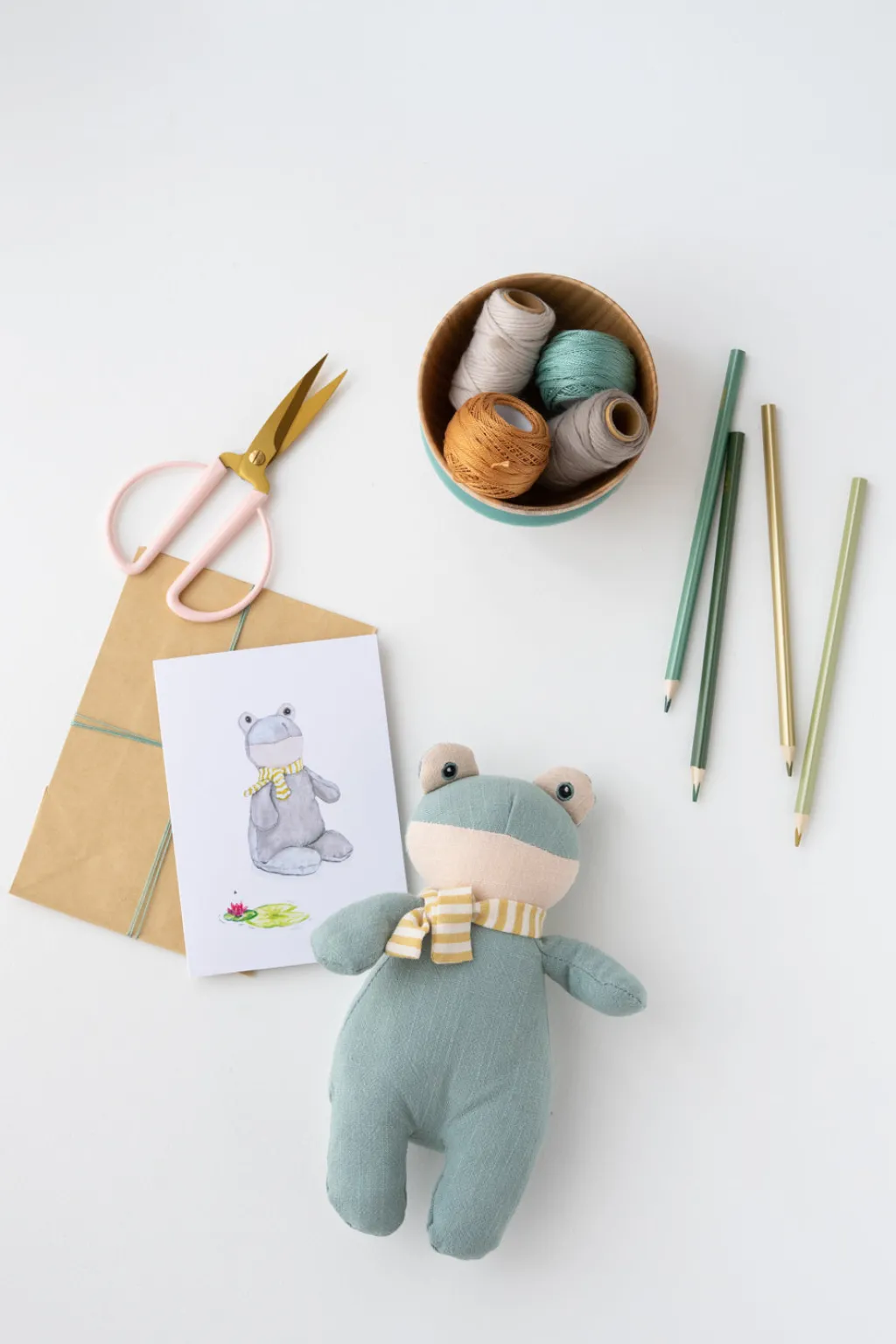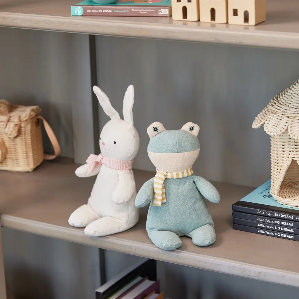 Friendly, fanciful Forrest the Frog is a cuddly weighted toy who enjoys the simple things in life. Forrest sometimes worries that lions, tigers & bears are coming to eat him, so he always wears a cosy striped scarf with his best friend Beatrix the Bunny to make himself feel safe & secure. Gentle Forrest loves a hot cup of fruit-fly cocoa at twilight, long leisurely walks across the lily-pads of his pond, & watercolour painting.