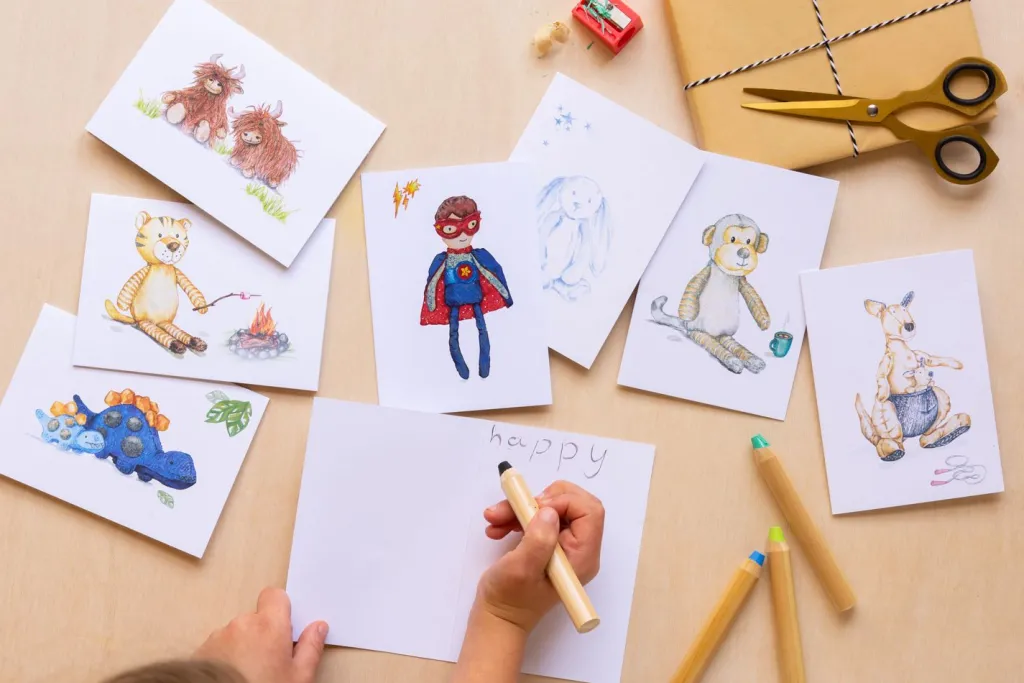Designed by a local Victorian artist & made in Australia, our captivating cards are a thoughtful accompaniment to the perfect children’s toy (or a handy addition to the present box at home). These versatile hand-illustrated cards are drawn from beloved characters in our collection, allowing you to mix or match with a Nana Huchy soft toy, doll, baby rattle, or Hoochy Coochie puppet comforter.