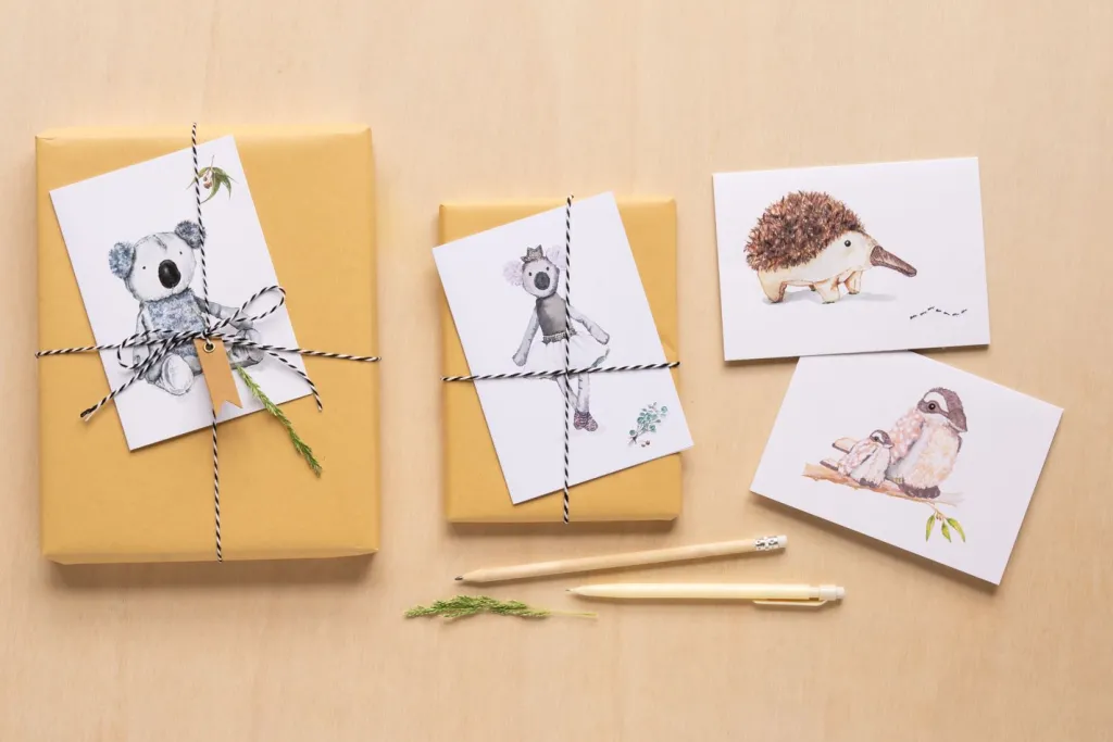 Designed by a local Victorian artist & made in Australia, our captivating cards are a thoughtful accompaniment to the perfect children’s toy (or a handy addition to the present box at home). These versatile hand-illustrated cards are drawn from beloved characters in our collection, allowing you to mix or match with a Nana Huchy soft toy, doll, baby rattle, or Hoochy Coochie puppet comforter.